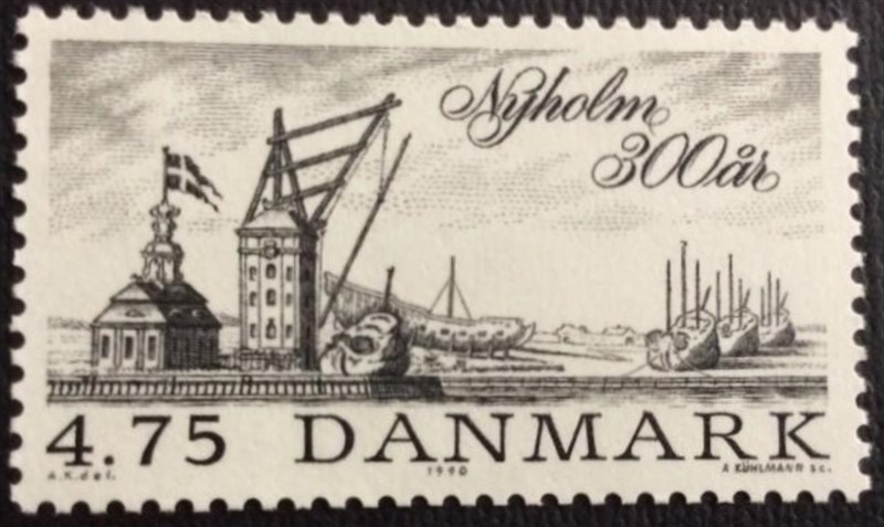 The Nyholm Guardhouse, built-in 1744, and the Nyholm Rigging Crane (c1746-1751), which are depicted on the stamp, have been a part of the Copenhagen skyline to the present day. The Guardhouse with its verdigris green tower and the Royal crown, was the setting of the story about the old chief gunner who one evening asked permission of the chief of the guard to lower the flag at the battery of “Sixtus” with the words “will the lieutenant permit the sun to go down?”