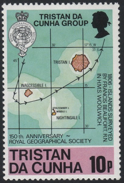 For the 150th anniversary of the Royal Geographical Society, Tristan da Cunha used four stamps of which the 10p stamp gives a name of a ship The WOOLWICH which under command of Frances Beaufort https://en.wikipedia.org/wiki/Francis_Beaufort#Command visited and charted the Tristan da Cunha Group on 28 April 1806, The stamp shows the route the WOOLWICH followed when she charted the islands.