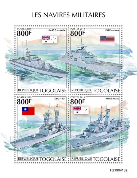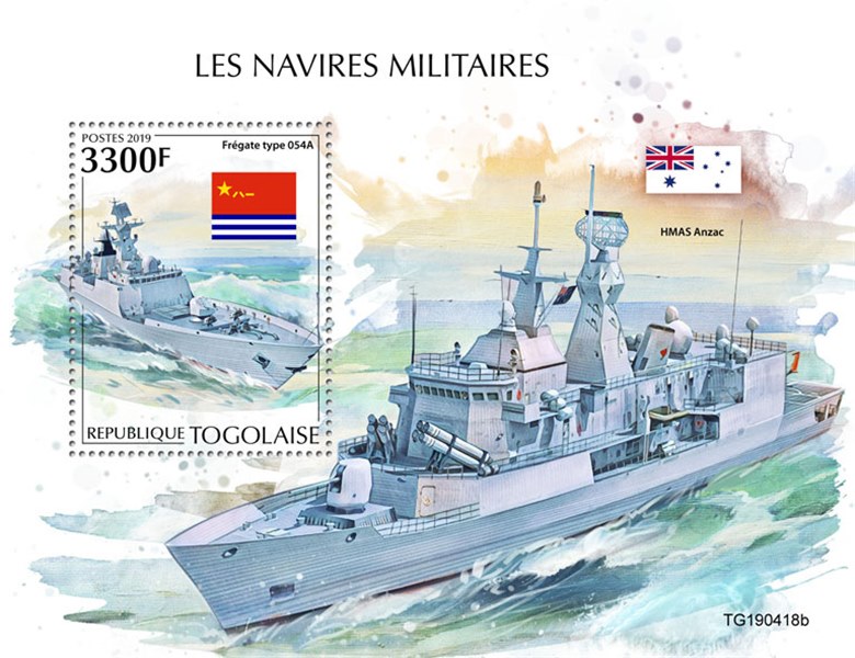 Togo issued in 2019 four stamps and a miniature sheet with modern warships.