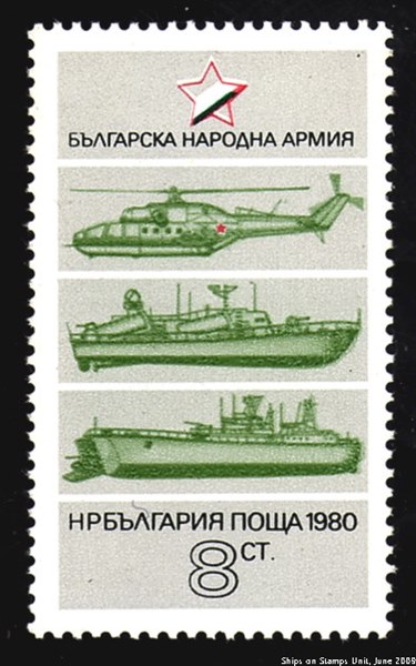 In 1980 Bulgaria issued one stamp of 8ct for the Bulgarian People’s Army. The stamp depicts a helicopter, a missile boat of the OSA type and an amphibious landing ship, what is given by Navicula and Stanley Gibbons as one of the Ropucha class. I think this is wrong the Bulgarian Navy has never had one of the Ropucha class in service till 1980. Photos of this class look also quite different as the image on the stamp.