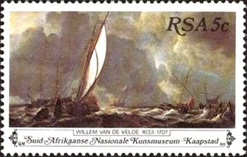 For the 50th Anniversary of the National Gallery, Cape Town (South Africa, 1980) the South African Post issued one stamp showing us a painting from Willem van der Velde 1633-1707 with sailing ships. I have not any information on the painting.