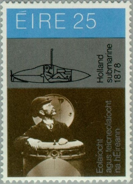 On 12 March 1981 Ireland honored four of her famous inventors, among them John. P. Holland, inventor of the submarine. The stamps were designed by Peter Wildbur and lithographed by the Irish Security Stamp Printing’