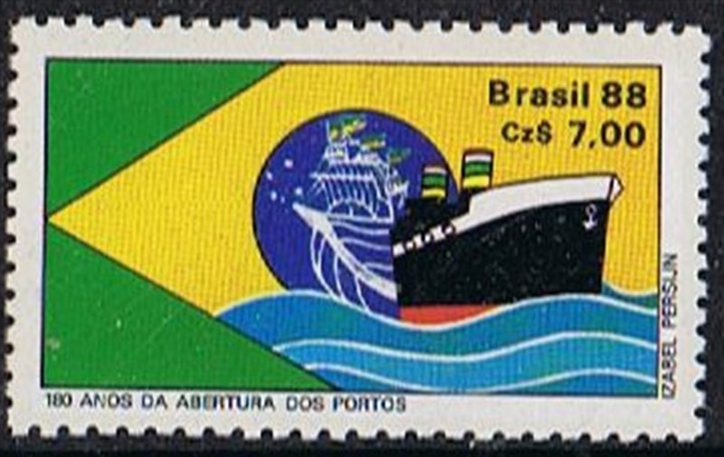 This stamp issued by Brazil in 1988 commemorates that 180 years ago all ports in Brazil were opened for international shipping.