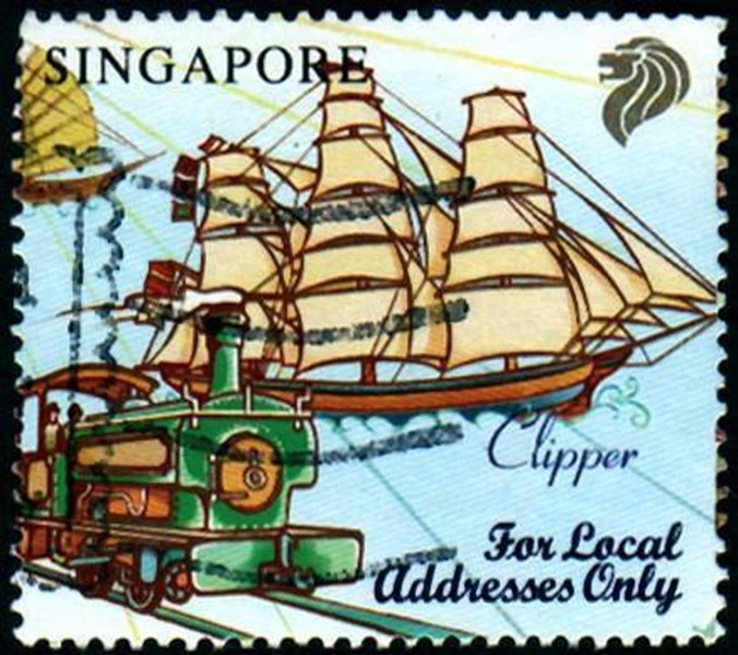 The 22c stamp issued by Singapore with a clipper ship has in the top on the left side another watercraft which is named by Stanley Gibbons Ships on Stamps as a Tongkang