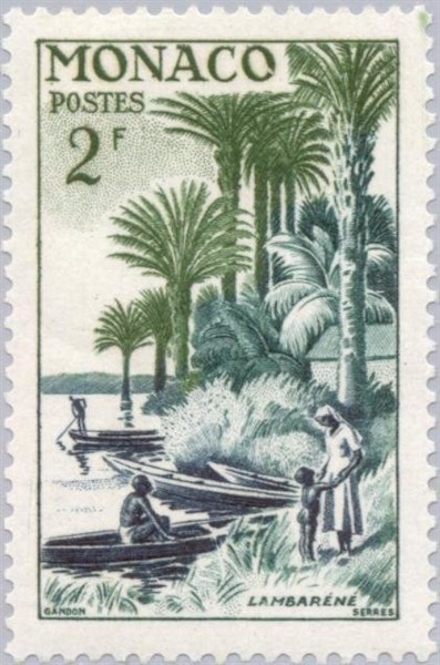 The hospital is built on the banks of the Ogooue River in Gabon, on the stamps you can see dugout canoes, “ouaro” a generic term used in Gabon for a canoe.