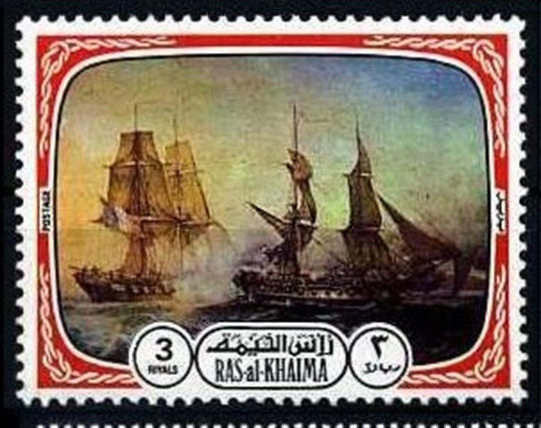 The stamp is designed after a painting made by Pierre Clement Marie Clausse “Cobat de Deux Bricks” this battle took place on 26 May 1811 and shows us the British HMS ALACRITY in action against the French L’ABEILLE. The stamp shows ABEILLE firing a broadside into the stern of ALACRITY.