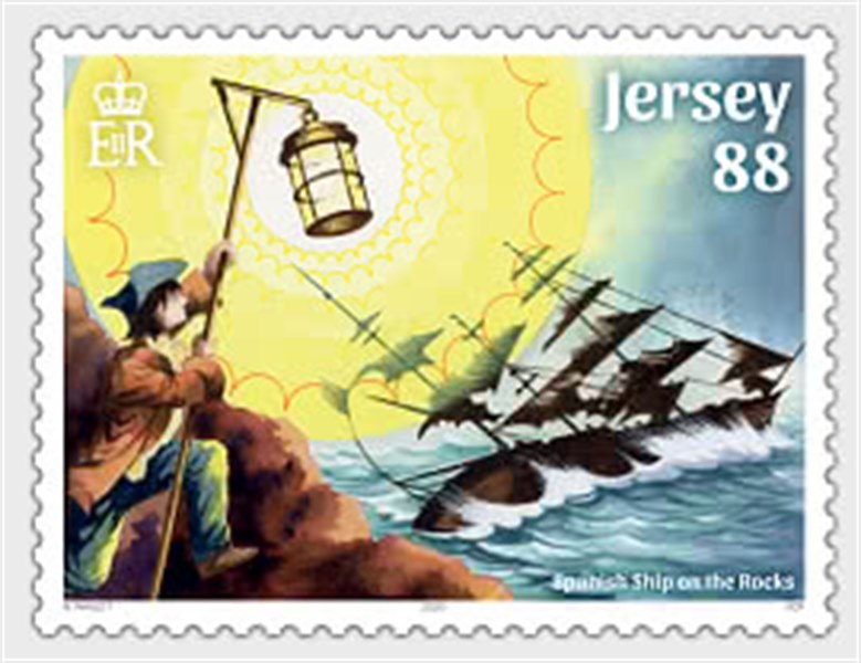 Only one stamp and the MS shows us a ship. The Jersey post did not give much information on the legends, but below is given what I found on the Spanish ship on the rocks.