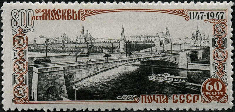 In 1947 the Soviet Union issued a series of stamp for the 800th anniversary of Moscow 1147 – 1947 which show us on one stamp of 60k the Moskvoretsky bridge in Moscow with before the bridge a waterbus of the moskvich type.