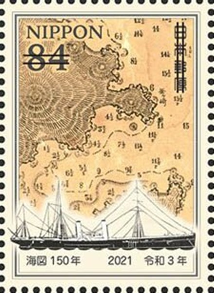 For the 150th anniversary of the commence of the first sea survey in Japan the Japanese Post issued 5 stamps., of which three stamps show us survey vessels, the KASUGA, and the newest survey vessel HEIYO NL 11 completed in 2020, one two stamps.