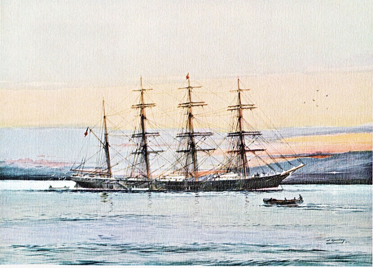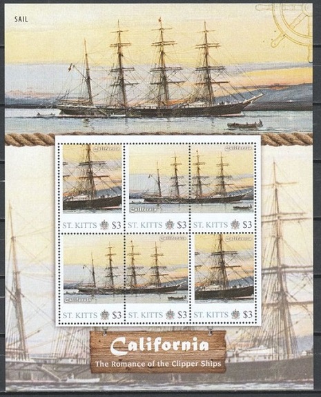 CALIFORNIA (1890 - 1927), tonnage 3,099 gross and 2,901 net, length 392ft 3in, beam 45ft 2in. depth 26ft 7in. Constructed of steel, built by Harland & Wollf, Belfast, for Ismay & Imrie Co of the White Star Line. As a four masted barque, she was built as a bulk carrier to bring wheat from the West Coast of North America to Great Britain. She was one of the four last sailing ships built by Harland & Wollf. In 1890, when new, she sailed from Liverpool to San Francisco in 130 days and made the return journey San Francisco to Liverpool in 1891 in 121days. In 1896, she was sold to another Liverpool firm who in the following yesr sold her to Robert Sloman of Hamburg who renamed her ALSTER. In 1912, the vessel was sold with others of the Sloman sailing ship fleet to E.C.Schramm & Co. and renamed CHRISTEL VINNEN. The outbreak of World War I found the vessel in Valparaiso where she was interned. During internment the crew did their best to disable her. She was allocated to Italy after the war but the Italians did not refit her. In 1926 she changed hands and was refitted for the nitrate trade. In January 1927 she loaded 5,000 tons of nitrates for Norfolk Virginia. She took 77 days to reach Panama and after being towed through the Canal stranded on the Island of Old Providence and was abandoned to the underwriters and was a total loss. The design stamp is made after painting of Jack Spurling.