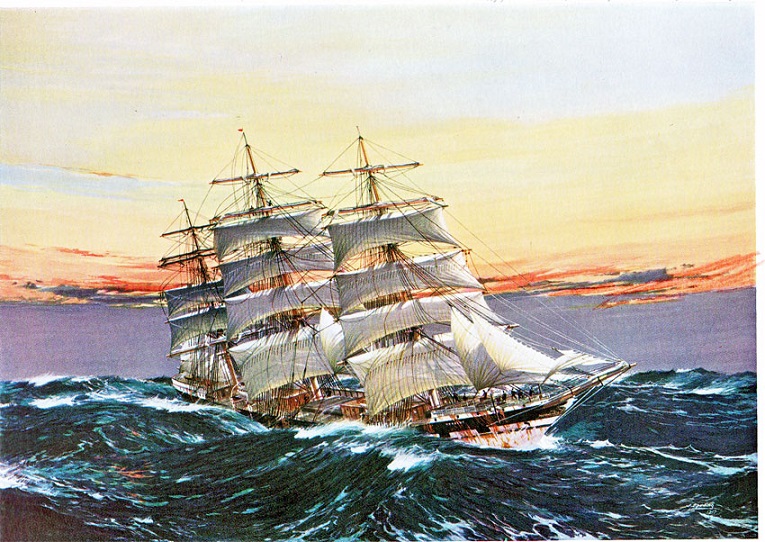 The «DERWENT» was a great example of a big full rigged ship. She had great sea-going qualities, good speed and an ample carrying ability. She worked the Sydney trade for twenty years for her owners, Messrs. Devitt & Moore. She was built by McMillan, of Dumbarton in 1884. As a general rule during these twenty years, she carried general cargo and a few passengers to Sydney and wool back to London. Her statistics were as follows: Tonnage - 1,970 tons gross; 275 feet in length; 40 feet 2 inches breadth; 23 feet 7 inches depth. During the twenty years, her heaviest general cargo was 3,845 tons and she loaded about 8,000 bales of wool for her return trips. Captain J. R. Andrews supervised her building and commanded the ship for the first ten years of her life. Due to his supervision of the construction, this ship had many new innovations. She was the first ship to cross steel topgallant yards and adopted rigging screws instead of deadeyes. She had a donkey boiler with winch barrels, a messenger connecting with the windlass, and a condenser of the latest type. She did not differ in appearance from the regular Clyde type of her date but she was a London ship and as such was run in true Blackwall fashion. Her crew always took a special pride in the painting of her fully carved lion figurehead with a great yellow main. She carried a crew of captain, three certified mates, eight midshipmen or cadets, twelve apprentices, bosun, sail maker, carpenter, donkey man, and fourteen hands in the fo’c’sle. The start of her career was not very good. She was sent from Glasgow on Christmas Eve and wound up anchoring in the worst of weather at the Tail of the Bank. She promptly dragged her anchors and the crew refused to do their duty! Captain Andrews could not be stopped by crew or weather and the DERWENT got underway three times, all three resulting in passing Tory Island and then being driven back. She was at last forced to shelter in Queenstown, where the men who refused duty were given sentences of from one to three months imprisonment. She finally left Queenstown on January 14, 1885 and reached Sydney on April 17, 93 days out with no trouble. Her return passage was also not to great, taking 111 days to get home. She was never one of the crack wool clipper ships of her day, but she was always very steady. She was also a favorite ship with the shippers due to the perfect way in which she was operated and the splendid state in which her cargoes were delivered - and she was never very far behind the crack clippers - she always made the January sales. Her best wool passage was 79 days in 1892-3. She had many other creditable runs - in 1897 DERWENT reached port on the same day as the very fast THESSALUS, although she had left Sydney five days earlier. Her best outward passage was 69 days to Port Phillip in 1892. Captain Andrews commanded until 1897 and kept her almost totally free of accidents. The most serious accident and the only one worth mentioning was when DERWENT was on her way down channel in May of 1897 and was involved in a collision with a French trawler, which forced her to put into Plymouth for repairs to her bows and starboard side. Captain Andrews was succeeded in turn by Captains W. W. Smith, H. de C. Wetherall and H. N. Forbes, the last of whom had her until she was sold to Chr. Nielson & Co. of Larvik, Norway, in 1904. The DERWENT survived the first world war and continued to carry cargo into the early 1920’s. In 1925 she shipped guano at Lobos de Tierra. Leaving Callao on July 3rd, she reached the island at noon on the 7th, where she loaded for Charleston, South Carolina. She began her last passage under sail on August 31st. She proceeded by way of the Panama Canal, arriving in Charleston on October 10th, 1925. She could not pick up a cargo at this port and had little prospect of making her way financially in the future. Therefore, her owners reluctantly sold her to a Charleston firm for the sum of $10, 250.00 and the ship was stripped and converted into a barge for coastal use. The design stamp is made after painting of Jack Spurling.
