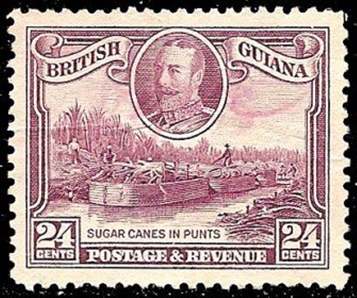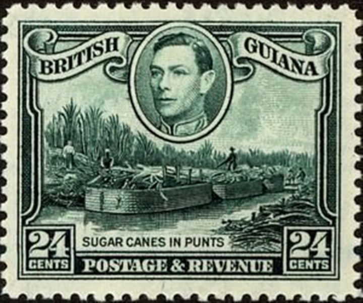 British Guiana now called Guiana issued three stamps which show us the transport of sugar cane to the factory. The ships depicted are called “punt”.