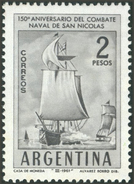 For the 150th anniversary of the battle of San Nicolas, https://en.wikipedia.org/wiki/Battle_of ... col%C3%A1s Argentine issued one stamp of 2p which show us the Argentinian squadron, of which the vessel in front is given as the 25 de MAYO.