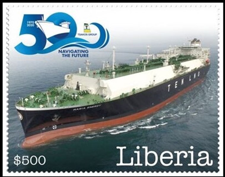 For the 50th Anniversary of the Tsakos Group, Liberia issued one stamp which shows us the LNG tanker MARIA ENERGY.