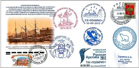 2013 Russian issues for the 140th Anniversary of the discovery of Franz Josef Land by the TEGETTHOFF which was used in that expedition, she is depicted on the left of the envelope. The ship depicted on the postmark is the POLARIS.