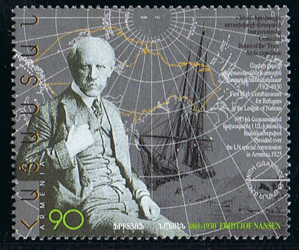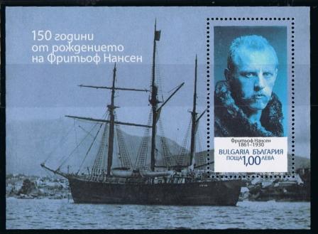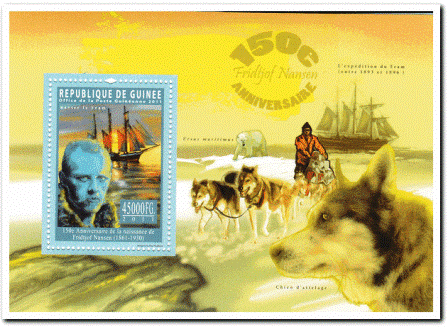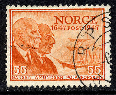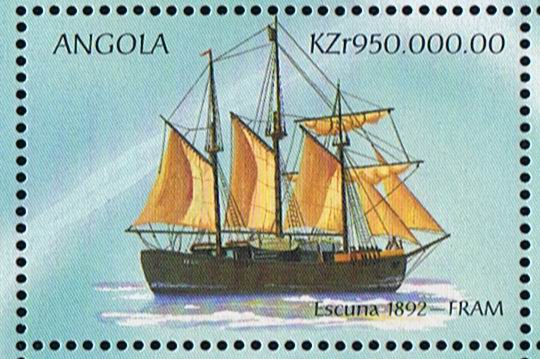 Nansen believed in bright, cheerful colours, and the Fram 's hull above the waterline was painted grey, the gunwale green, the poop scarlet, while red, white and green were the prevailing colours of the deck fittings. The whole expedition was fitted out most thoroughly—over £25,000 was expended upon the ship and her outfit, the vessel alone costing nearly £10,000. She is depicted on the first two stamps, with her two great navigators, Nansen and later Amundsen. She left Norway on June 24, 1893, and reached 85 deg. N., the farthest North any ship had been up to that time, and returned to Norway in 1896. In 1899 she was used by Sverdrup in his exploration of Jones Sound (Baffin Bay).
