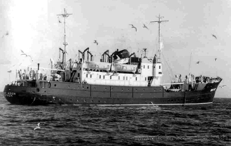 The fishery research vessel Robert Koch was ordered for the East German Government Fisheries Department (V.V.B der Fischwirtschaft) with headquarters at Rostock and is a motorship of 1.109 gross tons (322 net) on dimensions 216 ft.10 in. x 31 ft.10 in. 14 ft.9 in. built at Rostock by Neptunwerft in 1957.
