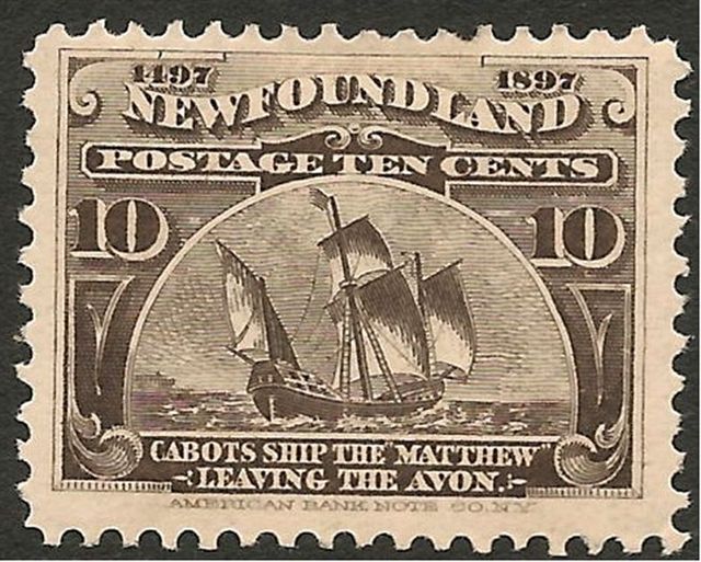 The first stamp to depict the Matthew appeared in 1897. The vessel was shown on the 10 cents value of a set of Ncwtoundland stamps serving the dual purpose of commemorating the fourth centenary of the discovery of Newfoundland by Cabot and the Diamond Jubilee of H.M. Queen Victoria. No model of the Matthew was available for the stamp, so the designers took the vignette of a U.S. stamp depicting Christopher Columbus's Santa Maria and renamed the vessel Matthew. Both vessels were of the same period, of course, and no one worried. It was not until I pointed out the fact some years ago to a very well-known philatelist that the plagiarism became generally known.