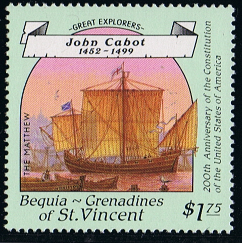 There has been some adverse criticism about spelling the name of Cabot's vessel on these stamps with two "T's' — Matthew. Actually, it is only a modernisation of the old name. The Bristol Customs records of 1503 refer to "the bark called the Mat hewe." An earlier account records: " 1496-7. This year on St. John the Baptist's day the land of America was found by the Merchants of Bristow in a shippe of Bristow, called the Mathew; the which ship departed from the port of Bristow the second day of May and came home again 6th of August next following." I have also seen the ship's name as Matthewe. So, with Shakespeare, one can only ask "What's in a name?"