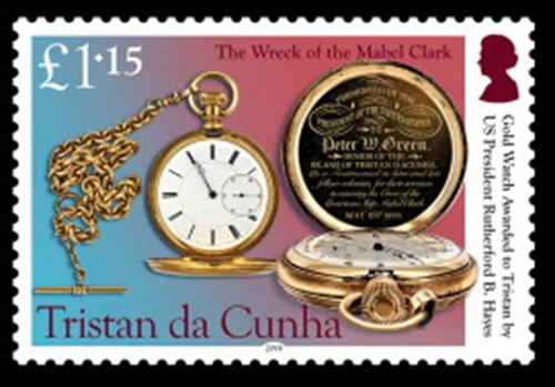 £1.15 – Gold chronometer awarded to Tristan by US President Rutherford B. Hayes. The inscription reads: “Presented by the President of the United States to Peter W. Green. Senior of the island of Tristan d’Acunha as a testimonial to him and his fellow Colonists for their services in rescuing the Crew of the American Ship MABEL CLARK May 1st. 1878.”