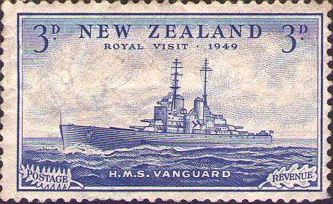 A set of 4 stamps was prepared for the New Zealand Post Office by Waterlow & Sons of London. When news that the tour was cancelled the stamps were ordered to be destroyed. Apparently some were caught in the door of the furnace and were salvaged; the rest were consigned to the flames. The 3d HMS Vanguard is mentioned in a note by Stanley Gibbons after SG 697. The issue is very expensive.