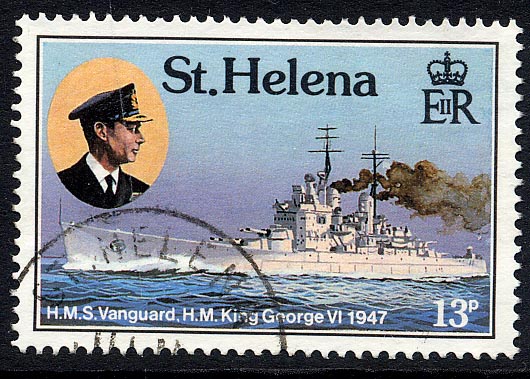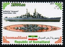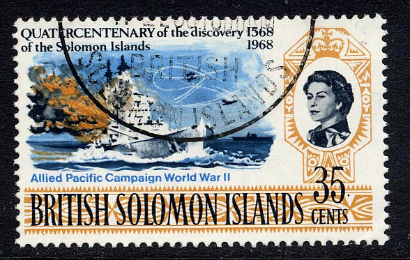 To commemorate the Allied Pacific Campaign of the Second World War, the British Solomon Islands issued a 35 c stamp showing a battleship, H.M.S. Vanguard, firing a broadside, although H.M.S. Vanguard, was not completed until April 1946. The stamp design is based on a photograph of the warship at firing practice, the 15 in. guns being those first mounted in H.M.S. Courageous and Glorious in 1917, and later removed from those ships to be added to reserve of weapons of that calibre maintained for the Hood, Queen Elizabeth and Royal Sovereign.