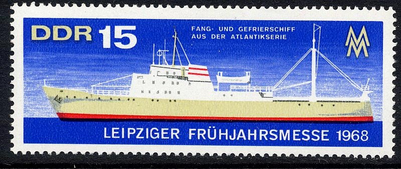 The Leipzig Fair 15 pf stamp shows the prototype of the "Atlantic" series of fish factory ships, built by V.E.B. Volkswerft, at Stralsund, East Germany. Propelled by diesel-electric machinery developing 2,630 h.p. they have a speed of 16.6 knots and have a processing capacity of 80 tons per day, with a refrigerating capacity of 45 tons per day. It is planned to build 102 vessels of this type by 1970, mainly for the U.S.S.R.