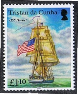 The 20p stamp of Tristan da Cunha issued in 2001 depicts two ships, the ship in the foreground is the HMS PENGUIN, the other ship must be USS HORNET.
