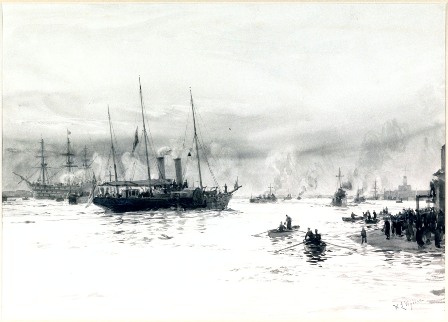 It took an hour for the ALBERTA to cross the Solent, arriving to large silent crowds of dignitaries and spectators in the late afternoon. A battery of guns from the local garrison announced the arrival, and a marine band struck up aboard HMS VICTORY as the ALBERTA tied up at the Clarence Yard. She spent the night here, with the Queen's coffin aboard under a continuous guard of honour.