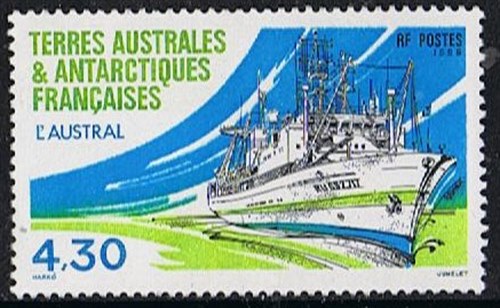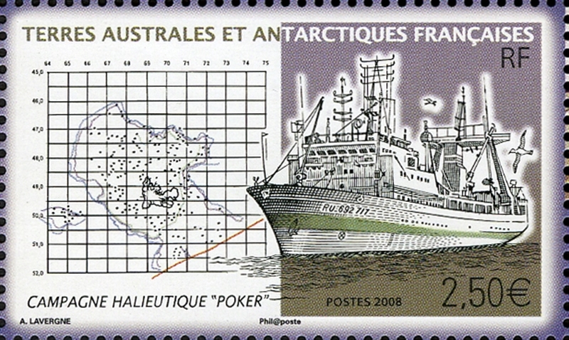 In January 2008 French Southern and Antarctic Territories issued a MS of 2.50 Euro for “Campagne POKER” on the stamp and also in the margin of these ms is depict the factory ship AUSTRAL.