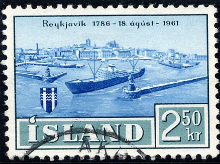 Iceland issued two stamps in the same design to mark the 175th anniversary of the granting of a municipal charter to the city of Reykjavik. These stamps are of the values 2.50 kronur and 4.50 kronur and the common design offers a modern view of Reykjavik harbour from a drawing by Kaukur Halldorsson. Passing out through the harbour mouth is the motorship Gullfoss, owned by the Icelandic Steamship Company of Reykjavik (Eimskipaffag Islands H /F). completed at the yard of Burmeister and Wain, Copenhagen in May 1950.