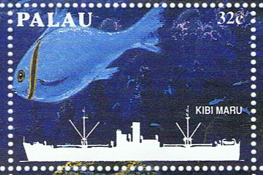 At the time of her sinking two Japanese ships carried the name KIBI MARU both were sunk during the air raids on the Palau Islands on 30 March 1944, which is depict on the stamp is not sure.