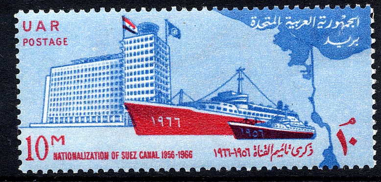 To mark the 10th anniversary of the nationalisation of the Suez Canal, the United Arab Republic issued a 10 m. commemorative stamp on July 26, 1966 show two ships of different sizes, the small one with 1956 on the side in Arabic numerals, the larger with 1966, representing the growth of canal traffic in the 10 years of Egyptian ownership. The building in the background is the headquarters of the Suez Canal Organisation.