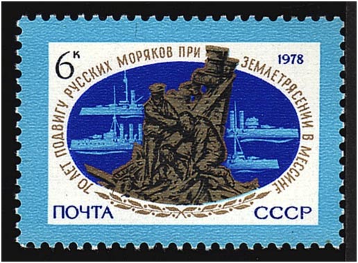 The Soviet Union in 1978 issued a stamp of 6k to remember the earthquake at Messina, Sicily, Italy in 1908, and the help the Imperial Russian Fleet was given to the victims of this quake. Four Russian warships are depict, and in the foreground a monument. The ships depict are the ADMIRAL MAKAROV, SLAVA, TSESAREVICH and BOGATYR.