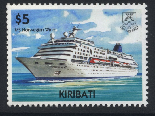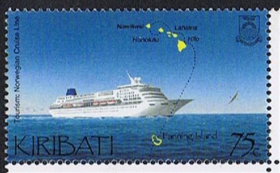 The Norwegian Cruise Line made weekly calls at Tabuaeran (Fanning Island) with the cruiseships based in Hawaii at that time the stamp was issued. The Federal regulations of the USA required foreign flagged ships to make a call at a foreign port, and Fanning Islands was the nearest port, the ships anchored at the road of the island and the passengers were transferred by tenders to the island.