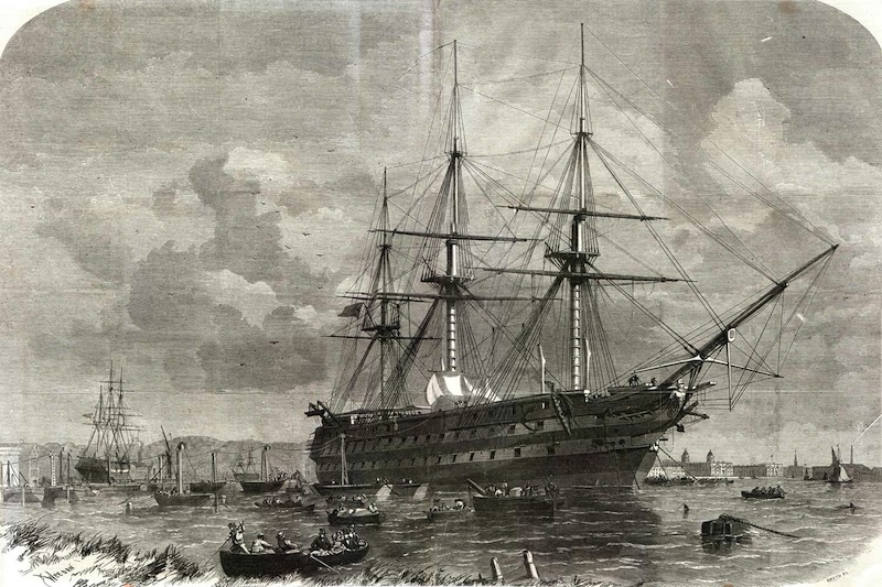 The Royal Navy loaned HMS Agamemnon, 3500ton 91 gun sailing Ship of the Line, the first to be built with a steam engine, and the United States Navy loaned the 5200ton Steam Screen Corvette Niagara, each was to lay half of the transatlantic cable. Agamemnon collected the Greenwich cable and Niagara loaded the Birkenhead cable.
