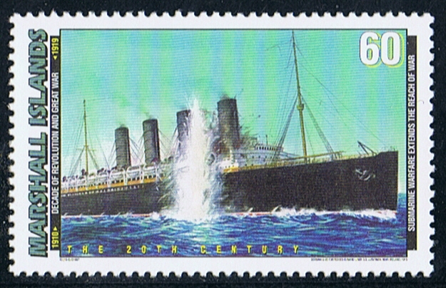 Before she left New York on 1 May 1915 the German authorities in the U.S.A. published warnings that she would be attacked by submarines, and advised passengers not to sail. The warnings were not regarded as serious, and it appears that warnings of German U-boat activity in the area were not signaled to her by the British Admiraralty on 6th May 1915 as she approached southern Ireland on a return passage from New York. According to her sailing orders she should have been steering a zig-zag course and had been instructed to keep away from landfalls. These instructions were ignored and she approached the Old Head of Kinsale on a steady course at a reduced speed of 21 knots when at 2.15 p.m. on 7 May two torpedoes struck her starboard side, fired from the German submarine U.20. Great loss of life was caused by the rapidity with which she sank-she went under in 20 minutes and because she was listing so heavily and was at so steep an angle bows down when she sank that it was difficult to get her lifeboats away.