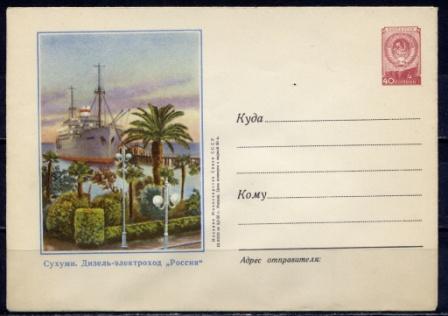 Second stamp shows a Russian vessel making her second appearance on stamps. I am told by an official Russian source that the ship on the 40k. stamp for the Odessa-Batum service is the Rossia, a far more accurate illustration of the vessel than appeared on the 1958 stamp issued by the U.S.S.R. on the occasion of their post office centenary when the ship was chosen to represent sea communications on the 1 rouble value (third stamp). She will be remembered under her former German name-Patria-as the liner in which Admiral Doenitz made his surrender to Allied officers at Flensburg in May 1945.