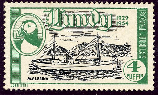 There is no separate post office building on the island but the postmaster, Mr. F. W. Gade, conducts business from his general shop. Lundy differs from other members of the Universal Postal Union in that incoming letters have to be stamped as well as outgoing. Incoming letters are stamped with the appropriate " puffinage" (Lundy's coinage is 12 "puffins" to the shilling) and stamps are cancelled with the Lundy postmark. Letters and parcels are delivered to the recipients against payment of the puffinage.To commemorate the silver jubilee of the service a series of surface mail stamps was issued on January 1, 1954 and the four puffin stamps of this set show the motorship Lerina. Postmaster Gade has provided the following particulars of the vessel's career. The Lerina, a wooden vessel, was built as an East coast drifter by Colby Brothers of Oulton Broad, Suffolk, in 1917, and was equipped with a 90hp. Bolinders engine. In 1921 she was bought by Mr. Augustus Langham Christie of Tapley Park, Instow, North Devon when Mr. Christie was the owner of Lundy. The fishing gear was taken out of the vessel and the hold and hatch modified for the carriage of cargo. To satisfy the requirements of the Board of Trade she was equipped with two 16-ft. lifeboats on davits as application had been submitted for her to carry 40 passengers in addition to crew. Two deckhouses were also fitted, one forward of the wheelhouse and the other abaft it. In October 1925 Mr. Martin Coles Harman, when he bought Lundy, also acquired the Lerina.