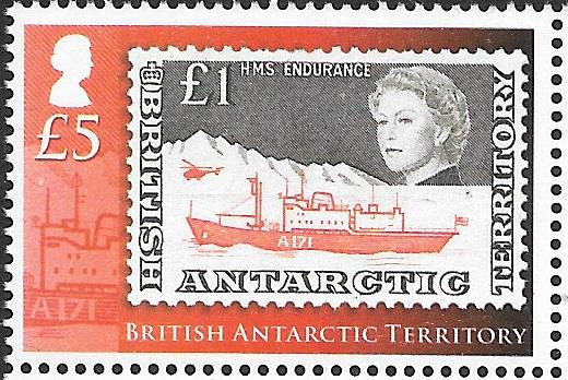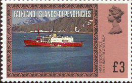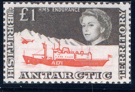 The £1 value of British Antarctic Territory depicting H.M.S. Endurance remains as before decimalisation. This vessel is the Royal Navy's ice patrol ship which supports British interests in Antarctic waters. In addition she assists the British Antarctic Survey in carrying out its scientific research programmes and is fitted with the latest hydrographic surveying equipment, since Antarctic waters are still largely uncharted and much work remains to be done. Successor to H.M.S. Protector (previously mentioned in these articles), the ship was originally the Danish merchant ship Anita Dan, which was specially constructed for operating in ice. She was converted for naval use, being given a flight deck and hangar for two Whirlwind helicopters. Scientific and surveying equipment was also installed.