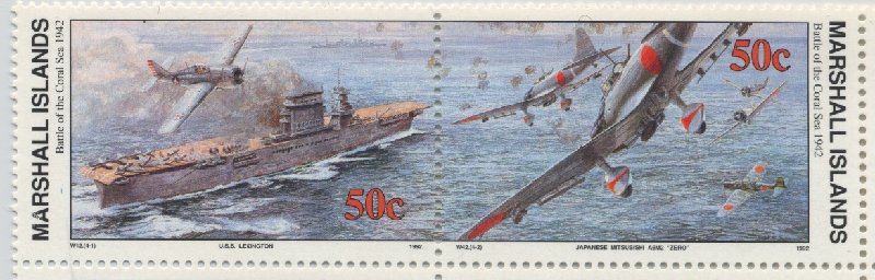 Originally the Lexington was designed as a battle cruiser and was to have had seven funnels, but when it was decided to alter her to an aircraft carrier during construction, the seven funnel uptakes were trucked together in one gigantic funnel casing. As the ship's bridge and control tops would have become almost untenable because of the heat from the equivalent of seven funnels in one, the bridge and control structure were separated. This is quite clearly shown on the stamp, and there is no doubt in my mind that the U.S.S. Lexington is the carrier depicted. To American Naval personnel the ship was affectionately known as "Lady Lex". Commanded by Capt. Frederick C. Sherman, she was known as a happy ship throughout the U.S. Navy, many of her crew having served in her since she was commissioned in 1927, In the Battle of the Coral Sea, she was flagship of Task Force No. II, with Rear-Admiral Aubrey W. Fitch on the bridge. On May 7, aircraft from the task force sank the Japanese carrier Shoho. She was smothered by 13 bomb and seven torpedo hits and sank within half-an-hour of the first attack, three carrier plane group attacks being made on her, with the loss of six U.S. Navy aircraft. The following day, May 8, at about 8.15 a.m., American aircraft located the Japanese carriers Shokaku and Zuikako, Japanese aircraft at the same time locating the American carriers Lexington and Saratoga.