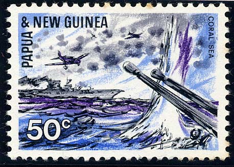 Four special commemoratives for the 25th anniversary of the war in the Pacific were issued by the Territory of Papua and New Guinea on August 30, 1967. The 50 cents stamp, designed by Mr. G. Wade, depicts his impression of an action in the Battle of the Coral Sea. It seems to me that the stamp designer has depicted an attack on the U.S.S. Lexington and the silhouette shows her huge funnel.