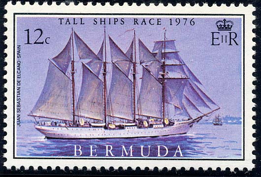 The 12c. stamp depicts the Spanish topsail schooner Juan Sebastian de Elcano, previously shown on aspanish 10p. stamp of 1964. Built by Echevarrieta y Larrinaga at Cadiz, in March 1927, she has a displacement at 3/4-load of 3,420 tons. Overall length is 308 ft beam 43 ft.; full load draft 23 ft. She carries four 6-pdr. guns. Her single Sulzer oil engine develops 800 b.h.p. giving her a speed of 9 knots. She carries 230 tons of oil; and is a single-screw vessel, with a range of 10,000 miles at 9.5 knots. The ship's complement is 224, with 80 cadets. The vessel is named after the first circumnavigator of the world, 1519-1520. She was designed by Mr. C. E.Nicholson, of Camper and Nicholsons Ltd., Southampton.