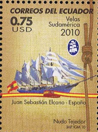 The stamp, with an intense blue background reminiscent of the sea, captures the profile image of Knights Guardiamarinas and the Ship JUAN SEBASTIAN ELCANO.