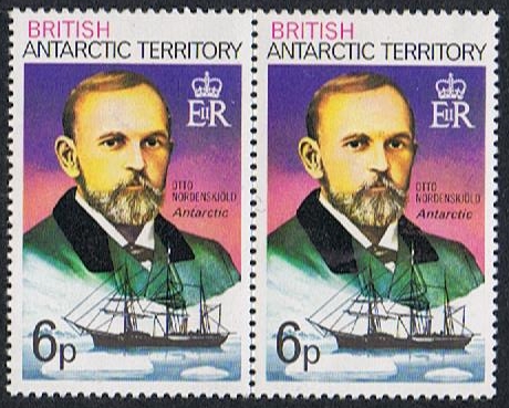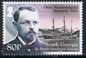 The 80p stamp features Otto Nordenskjöld, leader of the Swedish South Polar Expedition in 1902, and the expedition’s vessel ANTARCTIC. Nordenskjöld, a geologist, set up a shore station on Snow Hill Island on the Antarctic Peninsula and the ship, captained by C.A. Larsen, returned northwards to spend three months at South Georgia where exploration and scientific work was undertaken. Larsen realised the sheltered bay at Grytviken would make an excellent site for a whaling station and returned two years later to initiate the whaling industry on South Georgia.