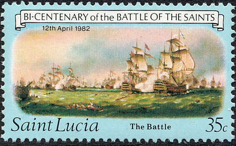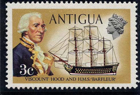The 3 cents stamp shows a painting by James Northcote in the National Maritime Museum of Samuel Viscount Hood in flag officer's full dress uniform of 1767-1783. His achievements in the West Indies were crowned by the part he played in the brilliant victory over the Compte de Grasse at the Battle of the Saints in 1782. In this he was second in command to Rodney and his ship was the Barfleur, second ship of the name in the Royal Navy. A 2nd Rate of 1,947 tons (builders' measurement), 98 guns, dimensions 178 ft. x 50'/2 ft. built at Chatham Dockyard, in 1768, she was broken up at Chatham in September 1819.