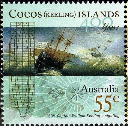 It was in this ship in 1609 that the captain discovered the islands to which he gave his name, still retained in the modern title Cocos (Keeling) Islands. The stamp designer has shown a typical ship of the period, a 4-masted galleon with square sails on the fore and main, and lateens on the after masts. It will be noticed that she is flying the Union Flag of England and Scotland on the main, introduced in 1606, the year of the ship's first voyage, so it is accurately shown on this commemorative for the discovery. SG20