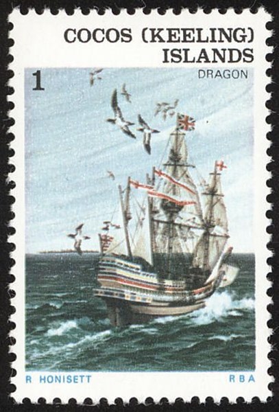 The lc. stamp shows the East India Company's Dragon, which sailed on the company's third voyage under command of Capt. William Keeling on March 12, 1606, her first for the Company.