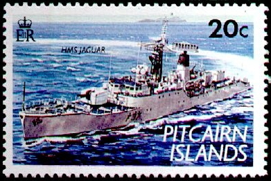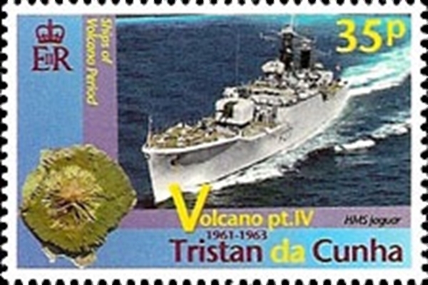 The 35p stamp shows HMS JAGUAR. In early 1962, The Royal Society mounted an expedition to Tristan to study the effects of the volcano on the flora and fauna of the island, as well as to study the volcanology of the island. The expedition had no remit to consider the possibility of the islanders returning. Prior to the expedition HMS JAGUAR visited the island on 16th December 1961 to make a preliminary investigation before the main expedition departed.