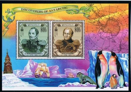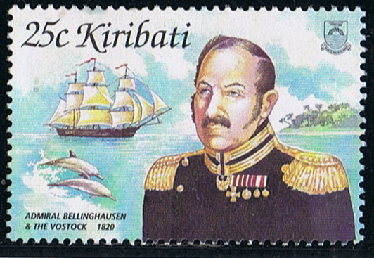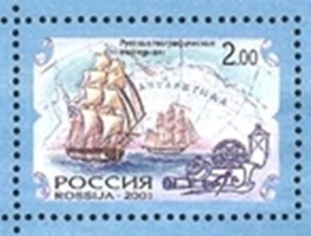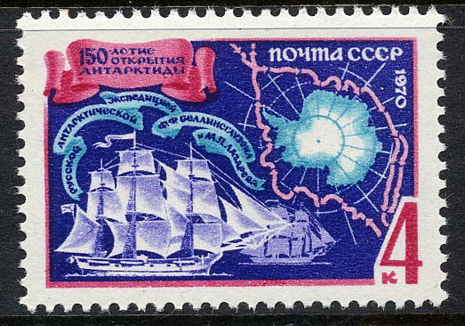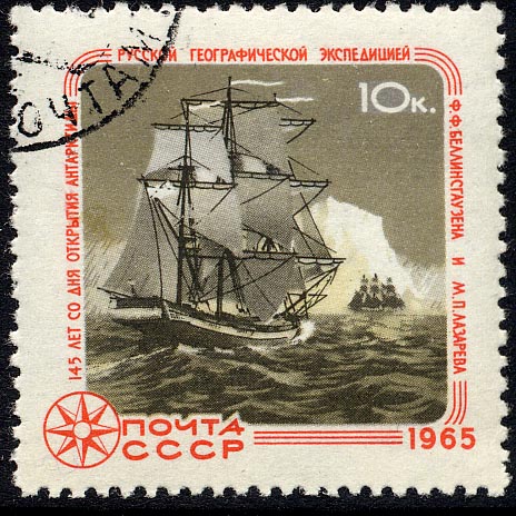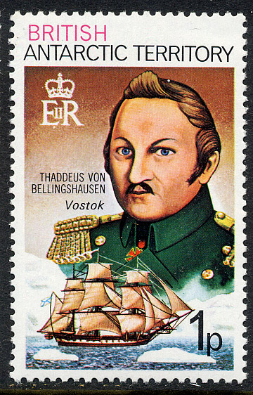 Admiral Fabian Gottlieb von Bellingshausen and his sloop Vostok are depicted on the 20c. stamp, which I notice gives his name as "Admiral T. Bellingshausen". Incidentally he is named "Thaddeus" on stamps of British Antarctic Territory issued in 1973 and if there is an explanation for the change of name, I am, not aware of it. He was a Russian Navy officer born in 1779, joining his country's navy in 1797 and taking part in a voyage around the world in 1803, when he was 24. In 1819 he was placed in command of a Russian expedition to explore the Antarctic. He had under his command two sloops of war, the Vostok and Mirny, with 190 men. His first objective was to complete a survey of South Georgia, which was begun by Captain Cook. The Vostok was the flagship of the expedition. She was 129 ft. 10 in. in length, with a beam of 32 ft. 8 in. and draft of 9 ft. 7 in., built at the Okhta Dockyard, St. Petersburg, by Stoke, in 1818. Like other Russian ships of the period she was built of unseasoned pinewood with only the usual strengthening. The underwater part of the ship had been reinforced and it was protected by copper sheathing on the outside. She was a sister ship to the Kamchatka which under Capt. Colovnin sailed round the world in 1817.